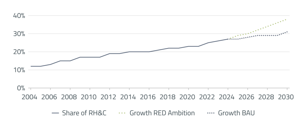 The figure below compares the recent evolution of the renewable share in H&C with two trajectories to 2030: business-as-usual (BAU) and the ambition implied by REDIII (+1.8 pp of yearly growth). The BAU line, extrapolated from historical data through 2024 using an exponential smoothing method, indicates that renewables in H&C continue to grow, albeit at a moderate pace. In contrast, the REDIII trajectory assumes an increase of around 1.8 percentage points per year and pulls away from the BAU curve.